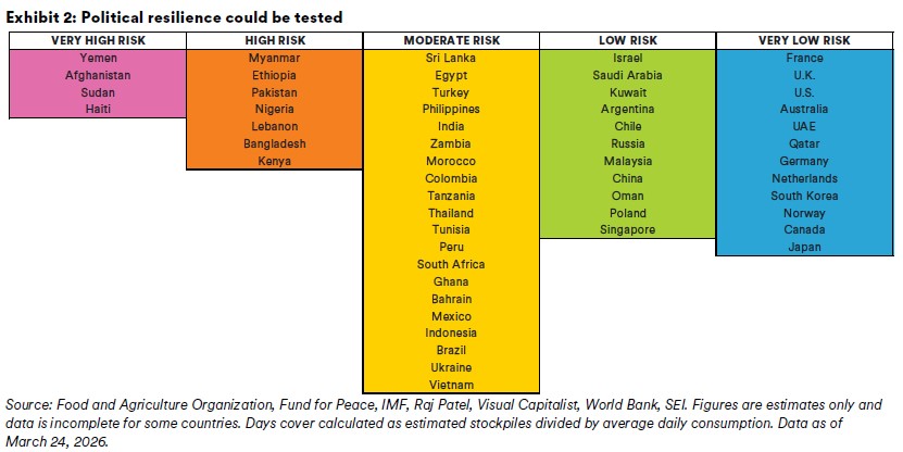 From a 30,000-foot level, the conflict is going to reallocate revenues, costs, income, and earnings across sectors, industries, income brackets, and geographies to as-yet-unknown extents and durations—with those shifts heavily dependent on the ultimate degree of intensity and persistence of the war. Several Asian countries are particularly exposed to Gulf region commodities and downstream goods. A number of countries will lose meaningful amounts of remittance income from migrant labor in Persian Gulf countries, and almost all countries will experience pressure on agricultural sectors due to the unavailability of key inputs. Following geopolitical shocks of recent decades, we’ve seen social and political unrest in some of the countries that were most negatively impacted, and that seems likely to recur in the wake of this conflict should it persist much longer. Looking at variables such as the percentages of energy, fertilizer, and food that are imported, foreign exchange reserves, and political-stability scores, we sought to identify the countries that might be most exposed to future instability. The results are shown in Exhibit 2, and it’s worth noting that there have already been rationing measures and initial unrest in a number of these countries, even those in the moderate-risk category. While these rankings are not something on which one should base their investment strategy, they can serve as a useful component of the investing roadmap that we’re trying to update.